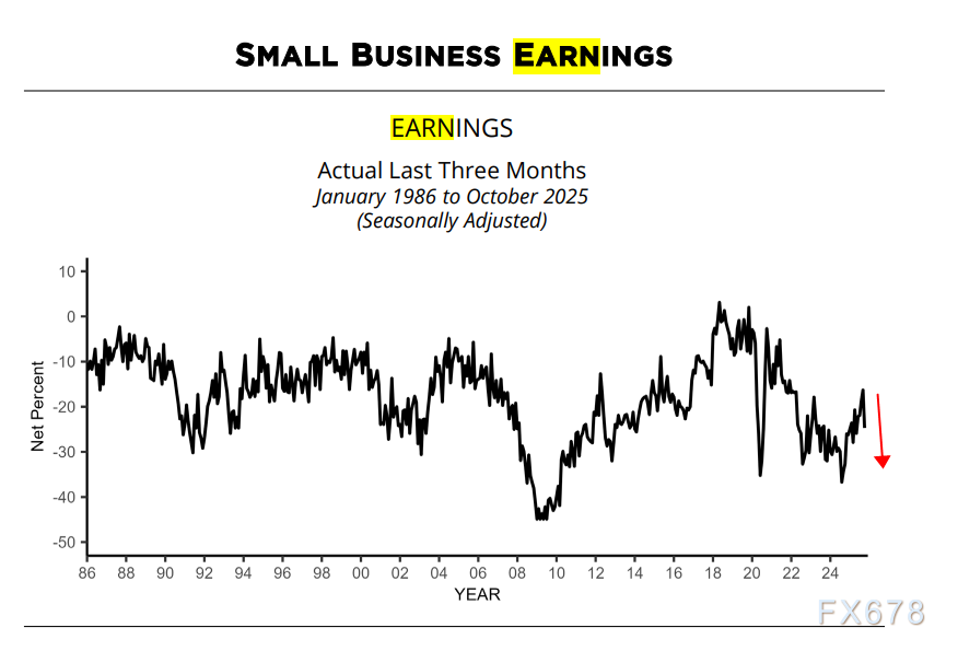 26%的企业主报告提高了薪酬(较9月降5个百分点),19%计划未来三个月提薪(与9月持平),盈利呈正增长趋势的企业主净比例为-25%(经季节性调整,较9月降9个百分点),是乐观指数下滑的最大推手。
