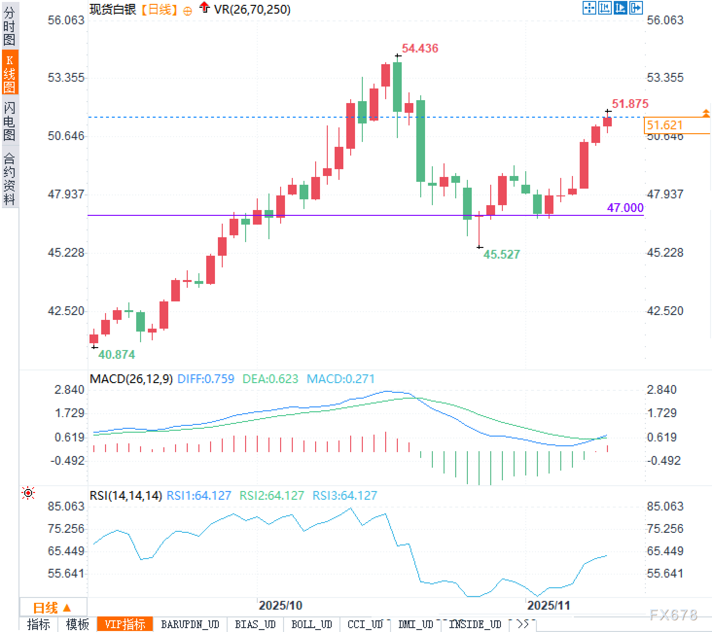 汇通财经APP讯——11月12日,星期三。贵金属在宏观预期与美元波动的交互下继续走强,现货白银延续五连阳后在高位整理,当前美市盘前交投51.50美元附近。市场核心线索仍在于美联储年内降息预期的再定价与实际利率的回落,而美国临时拨款法案推进带来的风险偏好改善,对避险需求形成一定对冲。