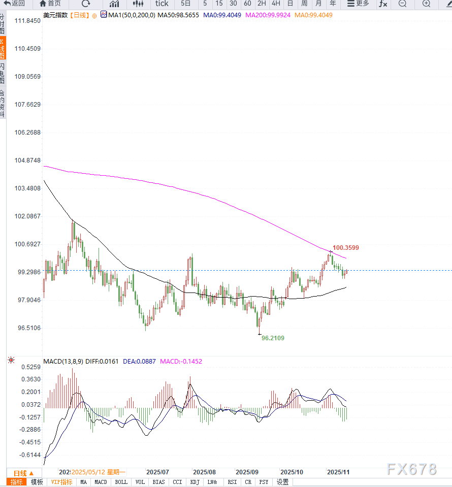 从日线级别来看,美元指数短期回踩之后企稳反弹,价格连续两日收于99.50附近,并持续在50日与200日均线之上运行,显示多头趋势稳固。