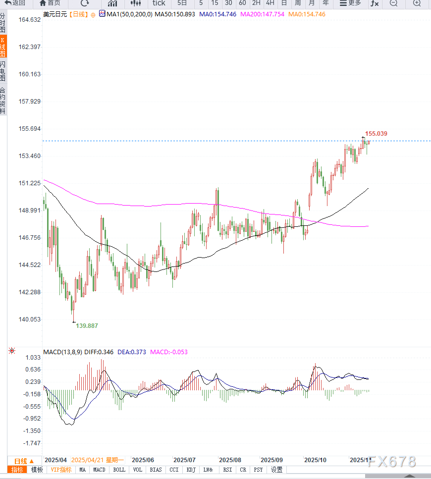 在外部环境方面,美元虽然因美国政府长期停摆后出现的数据延迟而缺乏明显优势,但日元的弱势更为突出,使USD/JPY维持在154.00–155.00区间上方。